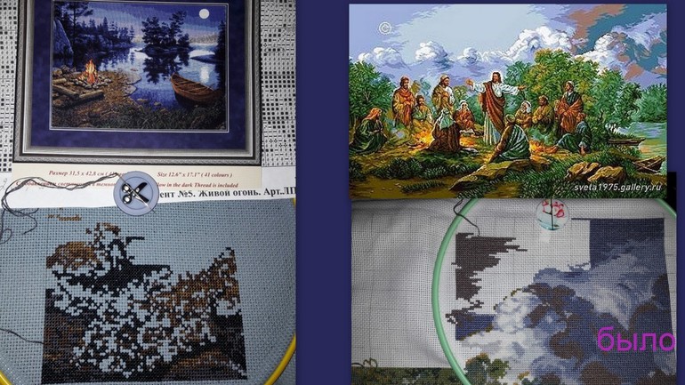 с апостолами нет картинки, что было..вообщем нижний правый угол был начат немного.. небо у меня здесь прям грозовое получается, если сравнивать с превью..но на превью родной отшив - а у меня горе-подбор)))) не очень я довольна свои подбором вслепую через две палитры ниток..но что выросло-то выросло, как говориться)))