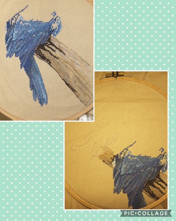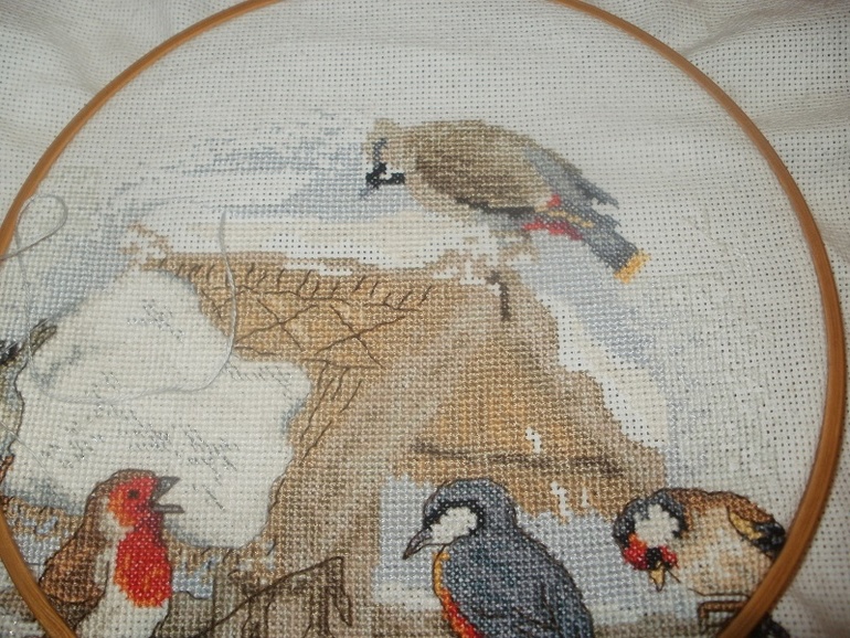 Я доделала на тельце птички бэк, переставила пяльцы, вышила продолжение веточки и начала крылышки феи. Вышиваются они полукрестом да в одну нить, и их плохо видно в электрическом освещении за которое я прошу прощения😐