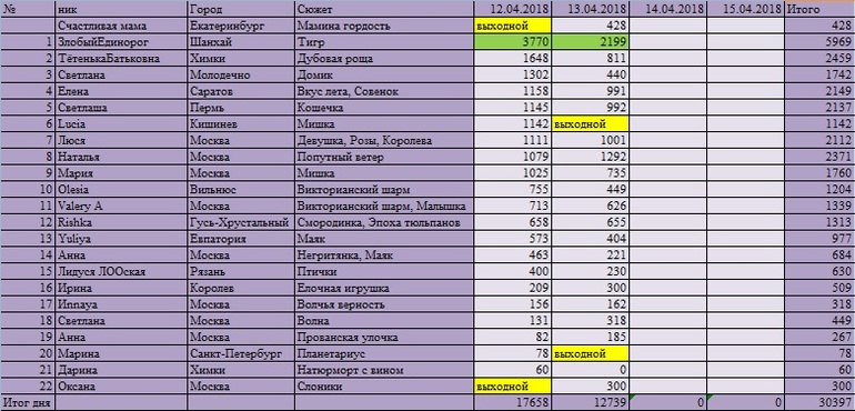 Игра "Вышивальный забег"Девочки, все немного сбавили темп, в итоге за день все вместе мы вышили на 5 тыс меньше. Ну ничего, до конца забега еще 2 дня, разгонимся :-)