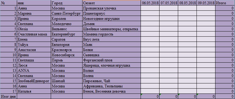 Игра "Вышивальный забег"Надеюсь, все, кто хотел, стартовали. Вот так выглядит наша стартовая табличка. Жду ваши первые отчеты до 6 мая 21:00. Всем удачи!