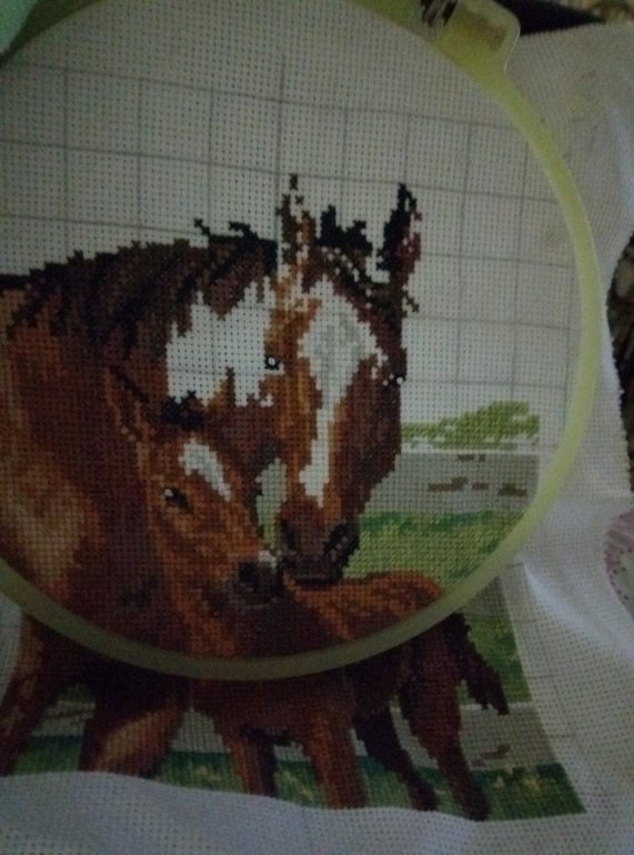 Всем привет. Сегодня удалось немного повышивать в перерывах между готовкой, стиркой, глажкой и кормлениями=) муж оформлял сегодня документы, делал ремонт и погулял со старшим. В итоге помощи от мужа сегодня меньше и вышила я немного меньше чем вчера=( зато доковыряла лошадок и наконец то закончила все коричневые оттенки
