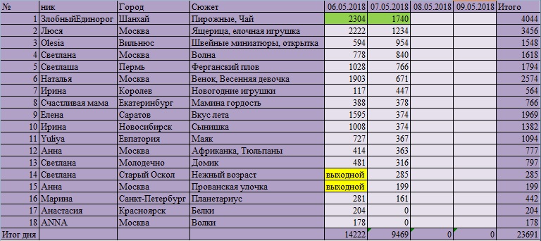 Игра "Вышивальный забег"День был будний, вышивали практически все меньше. Тем не менее 9469 крестиков совместно за день вышили :-) Лидирует сегодня снова ЗлобныйЕдинорог (1740 крестиков), на втором месте тоже без изменений - Люся (1234 крестика), а вот бронзу сегодня получила Olesia (954 крестика)