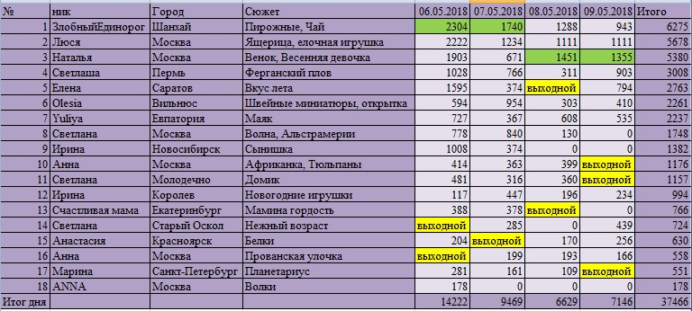 Игра "Вышивальный забег"Всех с праздником, с Днем Победы!!! Всем мира, добра и счастья! Итак, подвожу итоги забега. Несмотря на то, что 4 девочки не отчитались и 3 взяли выходной, за последний день нами было вышито больше, чем накануне :-) Все вместе за этот забег мы осилили 37466 крестиков! А лидерами забега стали: