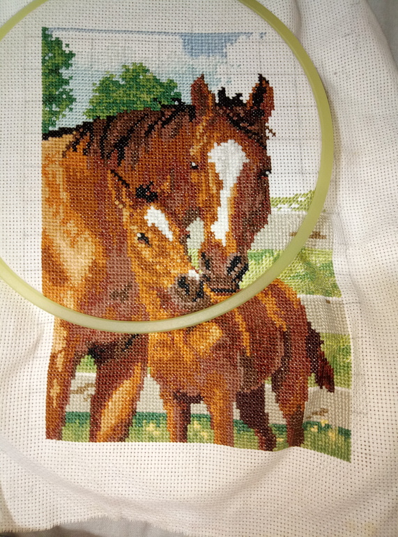 Я тоже пока вышивала коричневым лошадок, то тоже ждала когда начнётся синее небо и зелёные деревья
