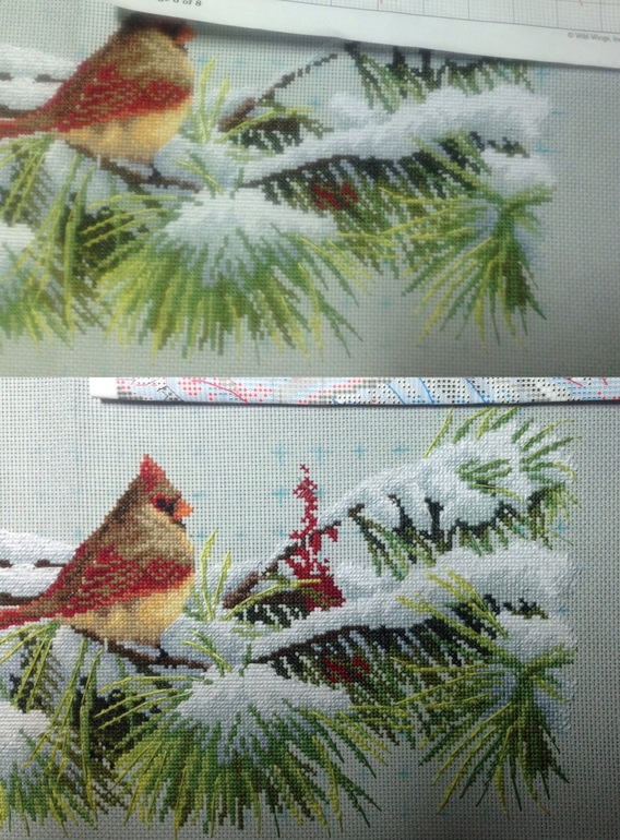 Привет! Тужусь и вышиваю))), хорошо что есть ВД, дисциплинирует, хочешь не хочешь, а надо! Вот если бы не готовила сегодня ужин, то наверное уже бы птичка была, шло хорошо, но пришлось оторваться от дела, и все...