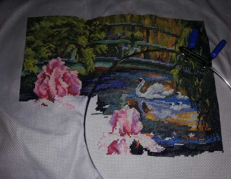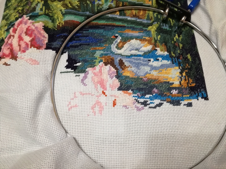 Всем привет! Заставки хороши! Я сделала бэк, передвинула пяльца и продолжаю фон.
