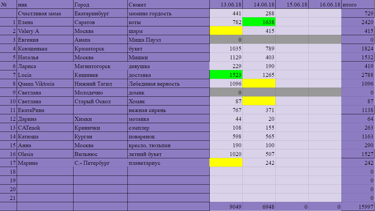 Игра "Вышивальный забег"Всем привет! Вот и перевалили мы экватор нашего забега, плохо что с потерями на старте... Лидер дня сегодня у нас сменился, в этот раз им оказалась Елена с результатом 1638 крестиков, за ней бежит вчерашний лидер Lucia с результатом 1265 крестиков и замыкает сегодня тройку лидеров Ксюшенька с результатом 789 крестиков. А в итоге за день общий результат немного скромнее 6948 крестиков. Правда опять есть потерявшиеся, но если что утром разберусь, а сейчас спать)))