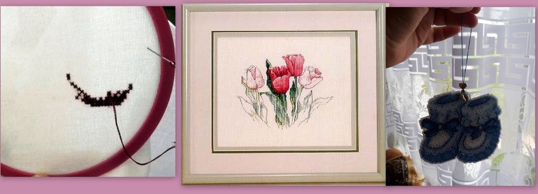 Привет! Я уже неделю в отпуске, но повышивать вволю пока не удалось)) Была в гостях в деревне, только вчера вернулись, до выходных останусь у мамы. Сейчас вечером выставила племянниц из комнаты (злая тётка) обманным путём - притворилась, что ложусь спать, выключила свет и выждала полчаса. Но вышивать не получается - освещение очень плохое. Начатая сумка слишком большая, чтобы возить её с собой, поэтому взяла небольшую картинку с тюльпанами. Вся надежда на забег. Надеюсь на следующей неделе не стыдно будет отчитаться. Хоть по теме совместника повышивать не удалось, но без дела я не сидела. Двоюродную сестру выписали из роддома, для неё сделала милую безделушку и связала носочки малышу. Еще соорудила подставку для карандашей, но дети ее уже куда-то утащили, покажу в другой раз.