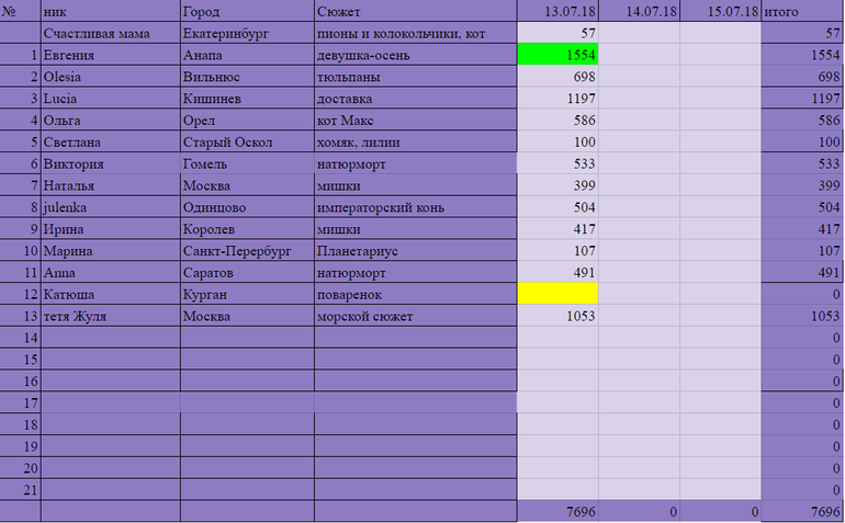 Игра "Вышивальный забег"И снова здравствуйте))) опоздавших больше не жду, надеюсь догонят,пока поставила выходной...А пока подведу итоги дня. Лидером сегодня стала Евгения с результатом 1554 крестика. За ней бежит Lucia с результатом 1197 и замыкает тройку сегодняшних лидеров тетя Жуля с результатом 1053 крестика. За день нами вышито 7696 крестиков!