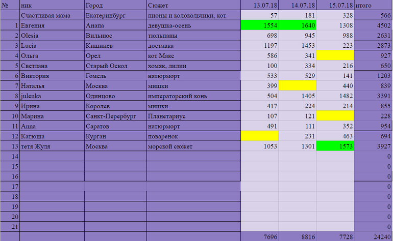 Игра "Вышивальный забег"Всем доброе утро. Ну вот и финиш нашего очередного забега. на август скорее всего сделаю перерыв с забегами потому что многие будут готовить детей в школу, делать заготовки на зиму и явно многим будет не до вышивки... Если вам перерыв не нужен прошу об этом написать в комментарии. Ну а теперь по итогам. Последний день был очень жарким в плане борьбы за тройку лидерства но вперед вышла тетя Жуля с результатом 1573 крестика, за ней с минимальным отрывом бежит julenka с результатом 1482 крестика и замыкает тройку лидер первых 2х дней Евгения с результатом 1308 крестиков. А за день вышито 7728 крестиков.