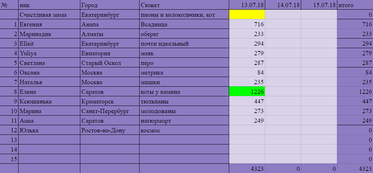 Игра "Вышивальный забег"Всем привет! Вот прямо хочется вас похвалить - никто не опоздал и не потерялся))) Лидером дня с большим отрывом сегодня стала Елена с результатом 1226 крестиков, за ней бежит Евгения с результатом 716 крестиков и замыкает нашу сегодняшнюю тройку лидеров Ксюшенька с результатом 447 крестиков. За день нами вышито 4323 крестика! Молодцы, бежим дальше