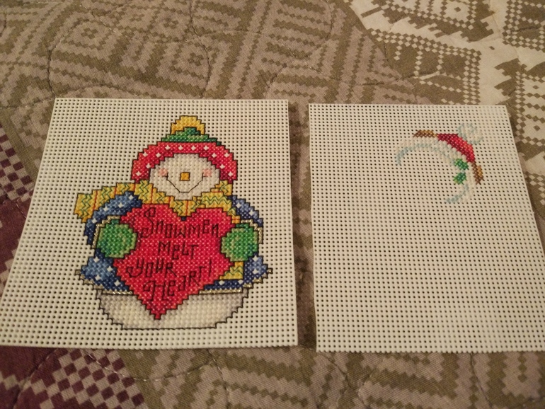 Снеговики - это Деды морозы?)) Мне с ними ещё работа предстоит, после сестры... Нитки все перемешаны и по вышивке видно, что крестики не ровно она шила все, как могла... Мне не нравится так дошивать после кого то, но и совсем бросить жалко тоже...