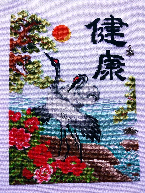 Я недавно закончила вот таких журавлей, на примету. Иероглифы означают "здоровье"