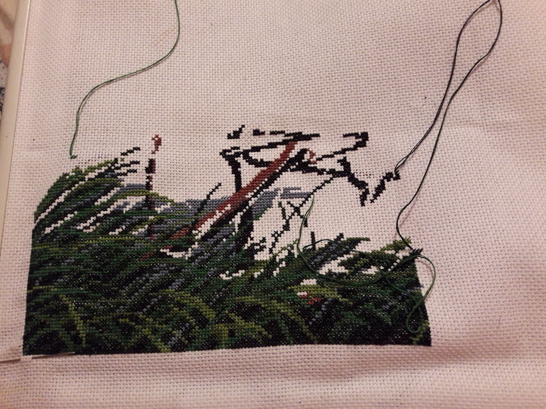 Я все так же вышиваю траву, но немного начала мостик. Что то тяжеловато мне на 18 канве, непревычно.