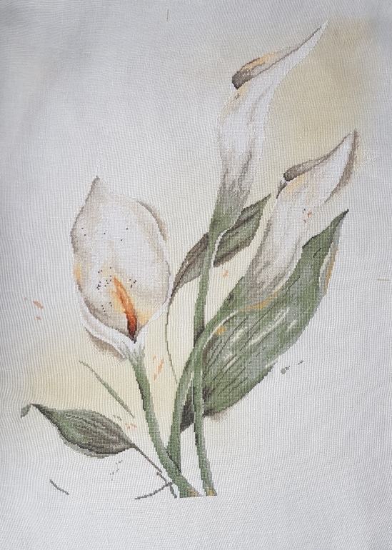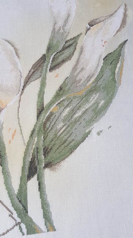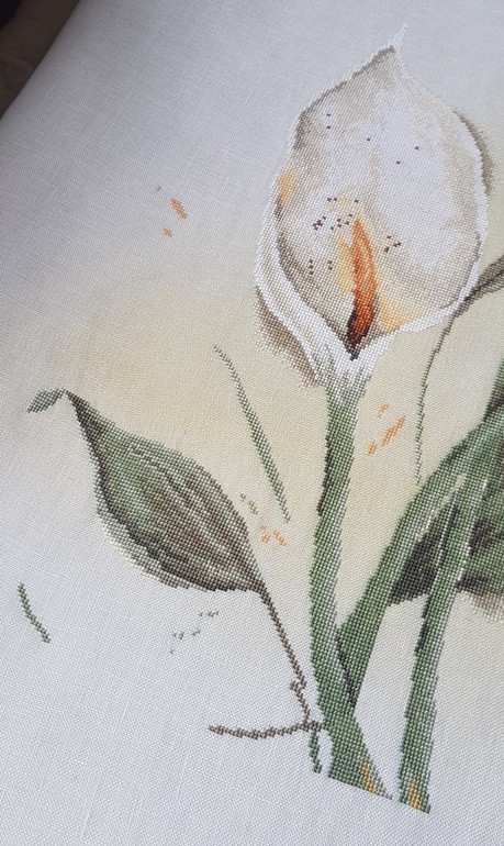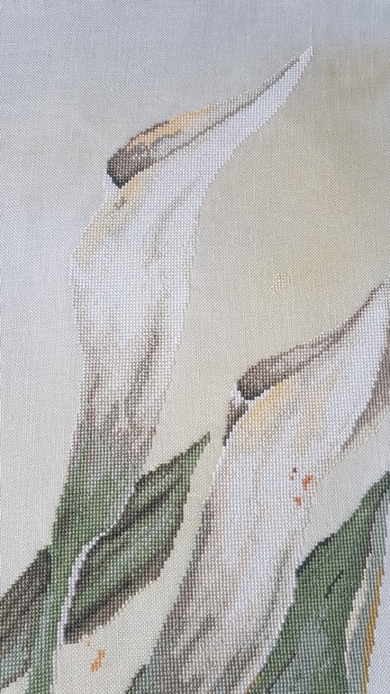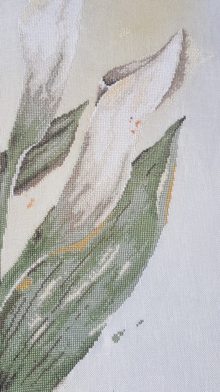 Размерчик немаленький: 50х60см. Вышивала по оригинальному набору на тонированном льне 30 размера. 33 цвета мулине. Крест в одну и две нити. Полное отсутствие бэка. Из недостатков для меня оказалась схема: слишком большой масштаб и распечатана на обычной бумаге. Из-за этого на местах сгибов довольно быстро начали стираться значки и рваться сам лист.