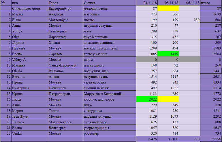 Игра "Вышивальный забег"Всем привет. У нас к сожалению Валерия совсем пропала, где-то отстала Люся. Но в остальном так держать, мы уже на финишной прямой. Лидером сегодня стала Елена со своими котиками и её результат 1419 крестиков, за ней сегодня бежит Екатерина с зимним пейзажем и результатом 1222 крестика и замыкает сегодняшнюю тройку лидеров Евгения которой совсем немного не хватило до 2 го места 1117 крестиков