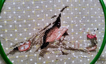 Ага, все очень медленно. Еще в одном месте вышила чуть больше цветом, чем нужно. Придется распарывать. Я сегодня на работу выхожу, опять нервы и усталость...Ничего! Буду ждать выходные, они уже скоро)))