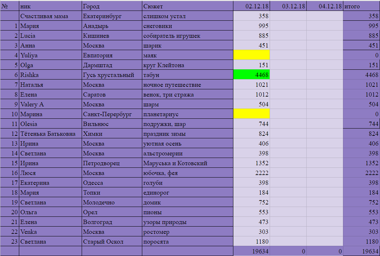 Игра "Вышивальный забег"Всем привет! Разрываюсь между написанием отчета, малым и готовкой...Ждала-ждала Юлю, но пока ставлю выходной и очень надеюсь что она нас догонит. Ну а теперь о радостном, об итогах дня. Лидером сегодня бесспорно стала Rishka с просто фантастическим результатом 4468 крестиков, за ней бежит Люся с красивым результатом 2222 крестика, ну и замыкает тройку лидеров сегодня Ирина с Маруськой и Котовским - 1352 крестика. Ну а за день нам удалось навышивать 19634 крестика. Молодцы!!!