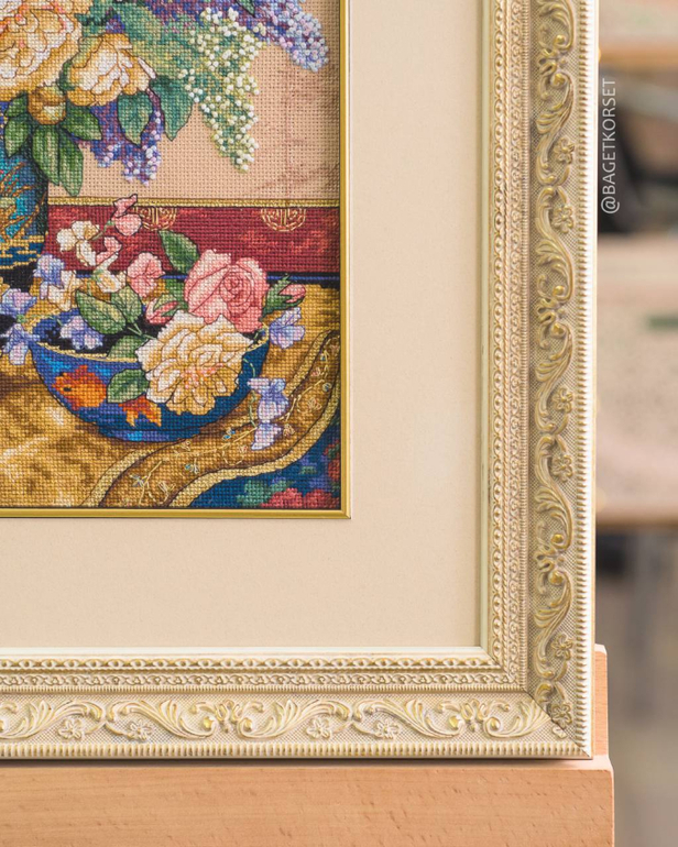 Итак, эта история началась в начал октября, когда в одной игре в ВК я выиграла сертификат на 1000 рублей на оформление в Багеткорсет, плюс бесплатная доставка в обе стороны. тк же свой сертификат мне подарила коллега по игре ) итого у меня было 2000. сразу решила, что отправлю Восточное великолепие, с оформлением определилась тоже заранее. цену мне сообщили сразу перед отправкой вышивки. списывались с менеджером в выходные в понедельник она обещала выслать мне накладную. прошло 2 недели, и только после моего вопроса, мне ее все-таки выслали. отправила в тот же день. менеджер написала, что как только вышивку получат, мне сразу напишут. прошел месяц, я упорно ждала сообщения, понимая, что есть какая-то очередь, но ведь просто сообщить о получении можно было. не дождавшись, пишу опять сама. оказалось, что они не стали искать переписку, т.к. много сообщений (хотя максимум 4-5 дней шла вышивка, не думаю,что было бы проблематично найти переписку), а телефон я не оставила (т.к. связываюсь с дистанционным оформлением впервые не знала об, а они не просили сразу. в этот же день согласовываем багет, оплачиваю, обещают через 2 недели будет готово. проходит 2 недели, опять тишина, пишу спустя несколько дней. обещают сделать в ближайшее время. в целом натягивали вышивку неделю точно.возникли трудности с выравниваем вертикальных полос на вышивке, перепробовав все, они предложили скобы, согласилась. со скобами тоже не сразу получилось.потом написали,что все готово, фото и отправка завтра. проходит несколько дней, спрашиваю,где обещанное фото, отвечают,что завал. проходит неделя, тишина.пишу опять, высылают фото и квитанцию об отправке. получала я в сдеке, упаковано отлично, положили подарки, 2 двойных паспарту, 4 заготовки для пинкипов и наперсток с их логотипом.