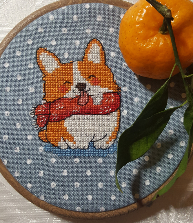 Раз тема отчета собаки, то тогда покажу свою собаку-улыбаку, бэк на которой дошивала на этой неделе. Очень позитивный пес, очень люблю коржиков)) Бесплатная схема Марии Бровко "Корги и снежок", с заменой канвы на лен, а ниток вообще на то, что нашлось дома)
