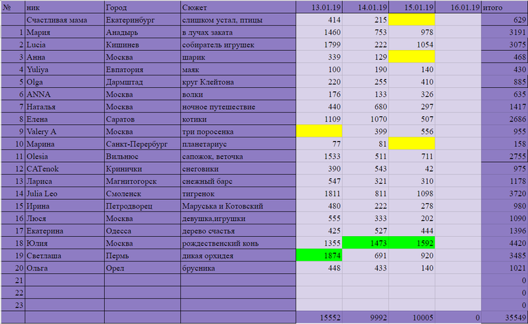 Игра "Вышивальный забег"Всем привет! Простите за небольшую задержку, муж устанавливал новую видеокарту и я ждала когда он закончит+купили мне новый телефон и в итоге сейчас все со старого телефона переносится на новый и табличку пришлось заполнять из отчета с компа (обычно на телефоне смотрю отчет и вношу данные в таблицу на компе чтобы не прыгать по вкладкам). Ну да ладно, главное что пишу сейчас! Мы вышли на финишную прямую, поэтому давайте поднажмем! Все большие молодцы. Лидером снова стала Юлия с результатом 1592 крестика, за ней бежит Julia Leo с результатом 1098 крестиков и буквально, наступая на пятки следом бежит Lucia с результатом 1054 крестика. Сегодня за день вышито чуть больше чем вчера что не может ни радовать - 10005 крестиков