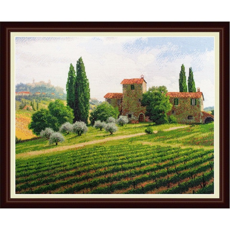 Комментарий автора «"Виноградники" от новой для меня "Оланты". Впечатления очень противоречивые. Нитки ДМС хорошего качества, но на бабинки намотаны не цельной пасмой, а большая половина, отрезками из 2-3 ниток. Их положено впритык, так что нужно вышивать экономно. Канва Цвайгард 16-го каунта. Схема вполне себе читабельна на 18-ти листах. Одиночек просто море, хотя справедливости ради, много кусков со сплошной зашивкой даже в самих виноградниках. Бэка совсем чуть-чуть. Непонятно зачем сделали в небе шахматку. В итоге работа получилась сочная, солнечная, яркая и жизнерадостная! Смело можно рекомендовать её всем любителям зелёного. Оформлять пока не буду - нужно дождаться в пару "Лавандовый прованс". Но когда это будет...»