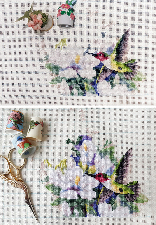 Посмотрела отшивы с колибри, разница заметна, но не критична в готовом варианте. Но если уже столько лет хочется отшить оригинальную работу, то однозначно стоит перепроверить все оттенки, тем более есть оригинальные остатки. Углубилась в эти отшивы настолько, что теперь и мне нужен такой венок. Ну и как теперь без него жить? 😻