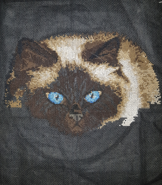 А ещё для звериного совместника достала свой бородатый долгострой толи с 2009, толи даже с 2008 года (уже и не помню). Это был мой первый набор, мои первые крестики... Ох и тяжко мне это далось и в итоге я забросила его в долгий ящик, сейчас поняла что созрела. Это надо же было начать с рто, с его мелкой черно-белой схемой, в данном дизайне ещё куча похожих оттенков и вдобавок ещё и чёрная канва... А забросила потому что решила поменять цвет глаз коту, вышила по набору зелёным и моя мама посмотрев на вышивку сказала что точь в точь как её любимый кот Макс только у Макса глаза голубые и мне эта мысль покоя не давала. Решила переделать глаза, но в то время я не слышала о том что изнанка должна быть более или менее красивой=) в итоге выпороть просто так цвета не получилось и я психанула... Сейчас нашла его, глаза с трудом выпорола и переделала