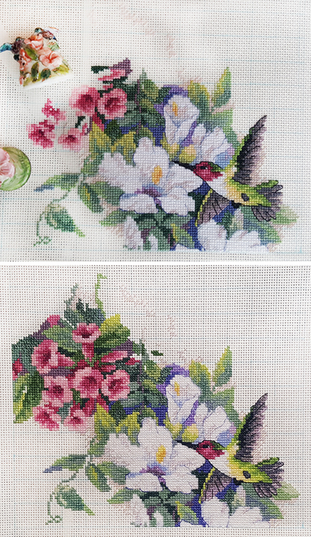 Ну а это мое было/стало. Вышивались камешки, но один из цветов серый, на мой взгляд, должен быть потемнее, но в наборе лежал такой, поэтому земля из каменистой, какой то песчаной получается.