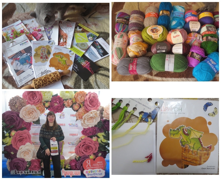 Всем привет, я в этот раз очень поздно отчитываюсь, так как коварный ротовирус настиг вчера внезапно, чувствую себя хреново.. А так хотелось похвастаться своей поездкой на Формулу Рукоделия в эти выходные... сил рассказывать нету, но коллаж покажу)) ..скромные покупки с выставки, бооольшая покупка с фабрики Семеновской пряжи (и нафига мне столько ниток, все равно еще ничего не связала))..