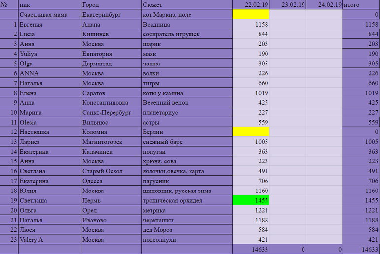 Игра "Вышивальный забег"Всем привет! Во-первых, поздравляю всех ваших мужчин с праздником!!! Во-вторых, хочу извиниться за опоздание с отчетом...но малой все еще не спит((( Я его посадила разбирать какую-то коробку мужа в которой куча проводов и успеваю писать))) И так....Где-то потерялся 1 человек и это печально. Ну да ладно, пусть догоняет. Лидером дня стала Светлаша с результатом 1455 крестиков, за ней бежит Ольга с результатом 1221 крестик и замыкает тройку лидеров Наталья из Иваново с результатом 1188 крестиков. Ух как сегодня лидеры у нас плотненько бегут))) За день мы несмотря на праздники наковыряли 14633 крестика!