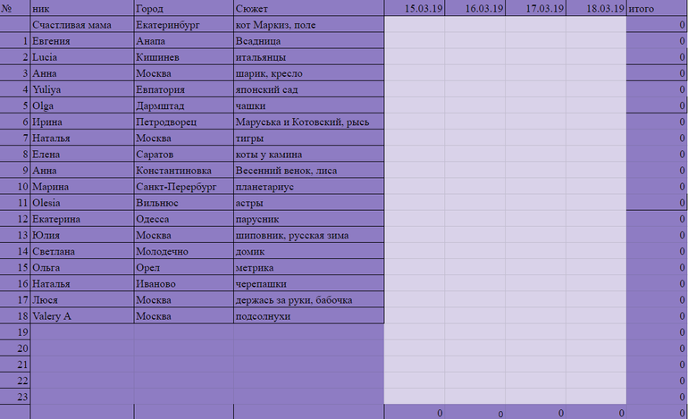 Игра "Вышивальный забег"Всем привет! На старт пришли не все кто записался, ну и ладно, может еще подбегут-место под них оставила в таблице))) Девочки поделитесь у кого как с погодой? У кого прямо весна, то делитесь фотографиями, хоть по фото полюбуемся весной...У меня лично ей и не пахнет((( Вроде все начало таять и вчера опять завалило снегом, да так что сегодня еле машину нашли и откопали