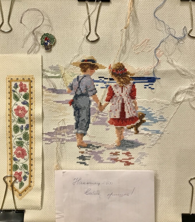 Привет! Ну вот я и дома. Буду вышивать детей и закладку. Закладка вышита, но я хочу ее сшить. Буду считать каждый стежок за полкреста, так?