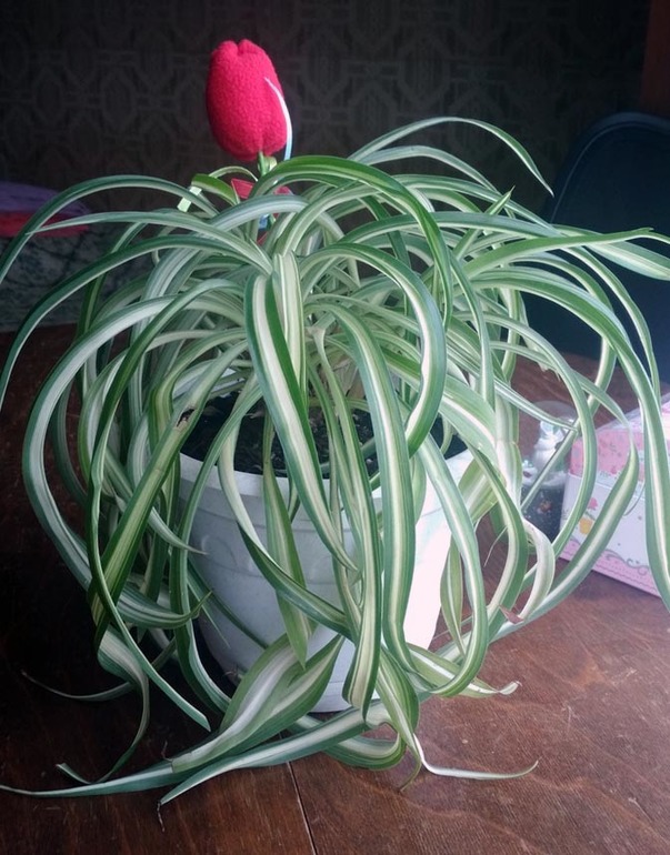 На улице у нас тоже потихоньку зеленеет, но градус заметно упал, холодно(( Дома у меня растет только хлорофитум, и то беднягу частенько забываю поливать, одно время было несколько фиалок, цвели красиво)) но потом тоже надоели и пали смертью храбрых. Вот мой на нынешний момент красавчик, он не цветет, это доча сшила тюльпанчик и мы его водрузили в горшок))