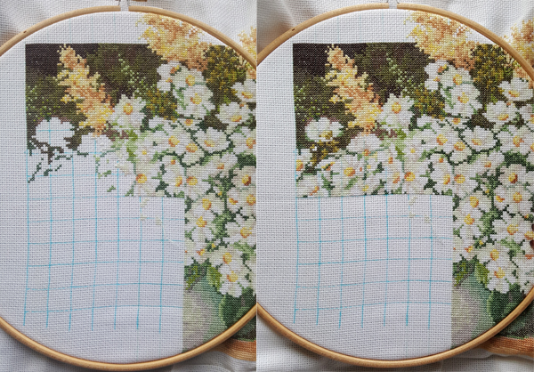 Тридцать с чем-то там цветов. В каждой ромашке их куча.. и очень тошно. Я их уже мучила в ВД в соседнем сообществе, не полегчало. И вышито уже столько, что жалко бросить.. Было/стало за эти выхи ( + почти 1000, а не заметно ни разу..)