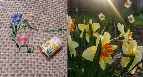 Ух, поспамлю сегодня фотографиями))) Выходные провела в позе испуганного подмосковного страуса, попом кверху, на дачных грядках и цветниках. Вышивка была задвинута на ночь, посевная жеж)) Оторвалась по полной. А потом села со своим меланжем за крокусы, и тут меня постигло глубокое разочарование.. Epic fail))) Ни фига он не смотрится на схеме Элизы. Совсем. Это не крокусы. Переходы очень короткие, этот меланж уходит в топку в коробку ждать новые идеи. Шовчиковые рисунки с ним пойдут хорошо, но я их не хочу.. смотрите сами, ну и наперсток с дачными нарциссами до кучи)