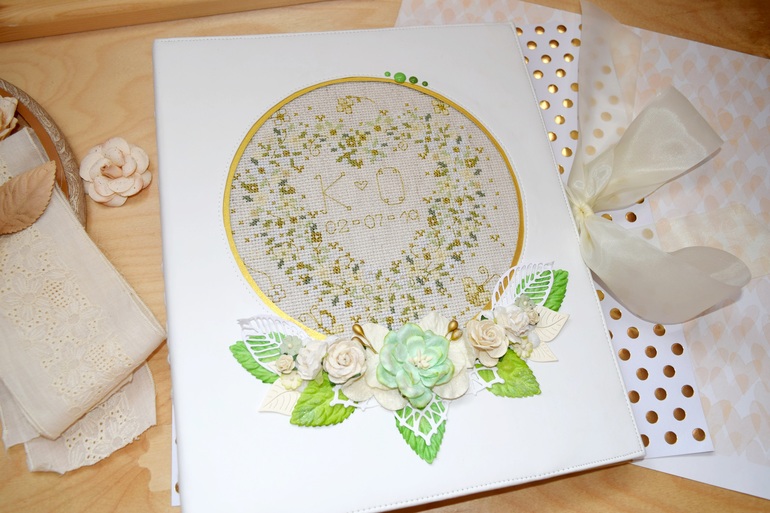 Впервые мне довелось оформить вышивку подобным нетипичным образом) Саму метрику вышивала не я, меня попросили оформить ее в книгу пожеланий, чтобы преподнести молодым на свадьбу. В мою задачу вошло подчеркнуть вышивку оформлением внутри и снаружи.