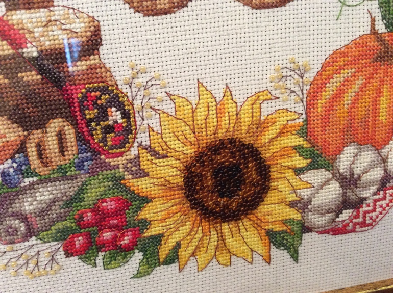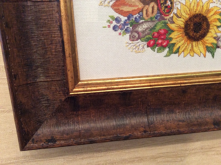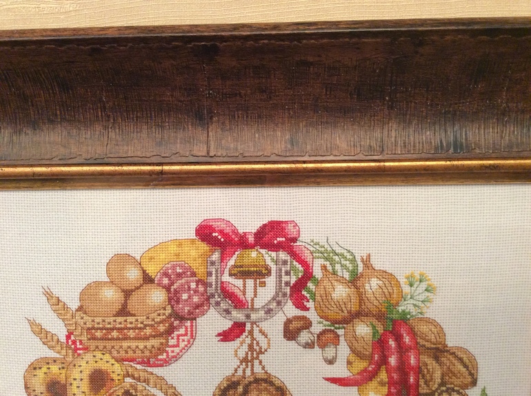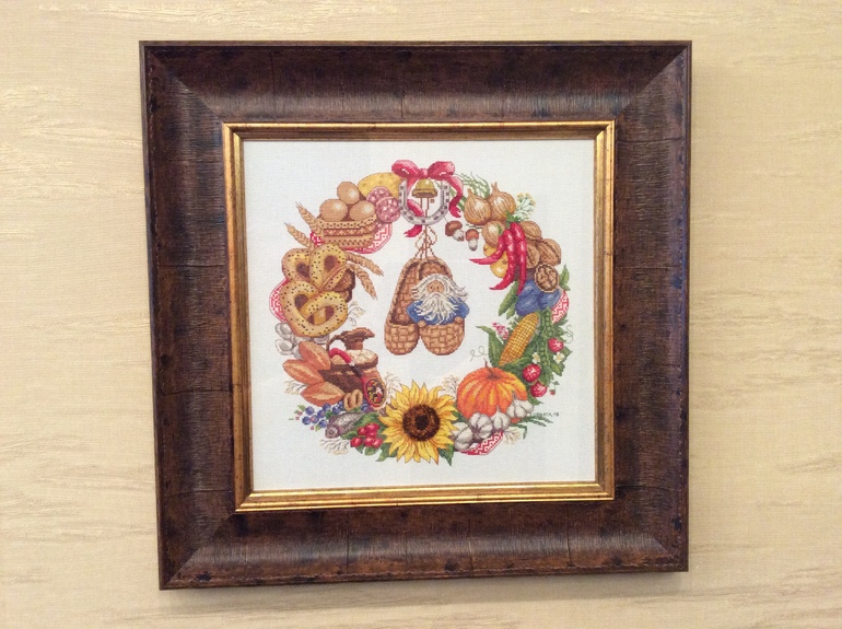 Начну с домового. Это Венок изобилия от Panna. Вышила ещё в прошлом году. Так как есть объемный бисер, а паспарту делать не хотелось, сделали двойную раму. Первая тонкая золотая рамка, вторая под дерево и стекло между ними, приподнято от работы на 5 мм. Планируется на дачу на стены, обитые деревянной вагонкой, должно неплохо смотреться на деревянной стене.
