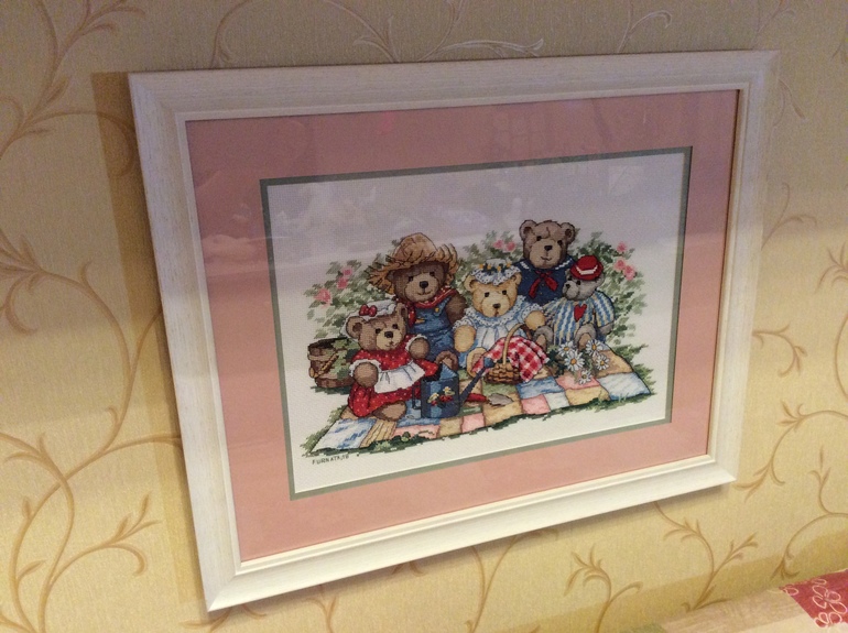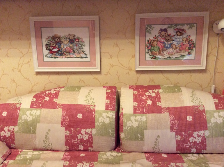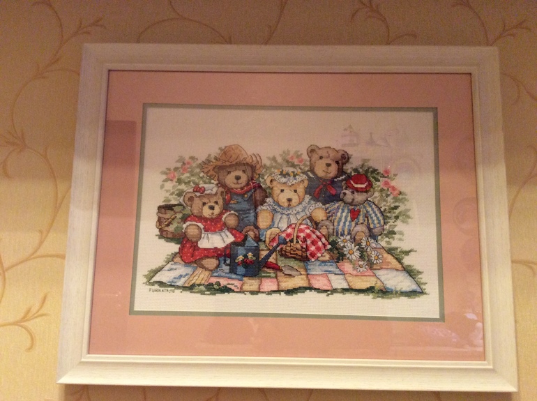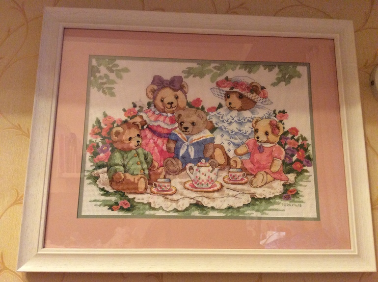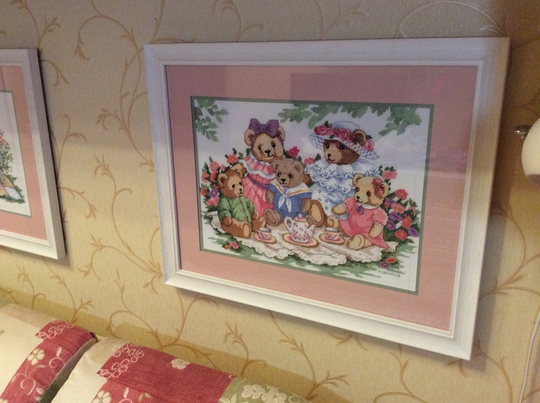 Ну, и на десерт - зефирное оформление двух медвежьих сюжетов от Дим: Пикник мишек и Чаепитие мишек. С самого начала задумывались вот в таком виде в комнату к моей дочке. Немного поздновато, конечно, уже вышито год назад. Дочка то растёт, почти подросток. Но, думаю, ещё пару лет можно повисеть. А потом как раз комнату будем менять, мебель уже подпорчена. Заодно и экспозицию сменим :-)))