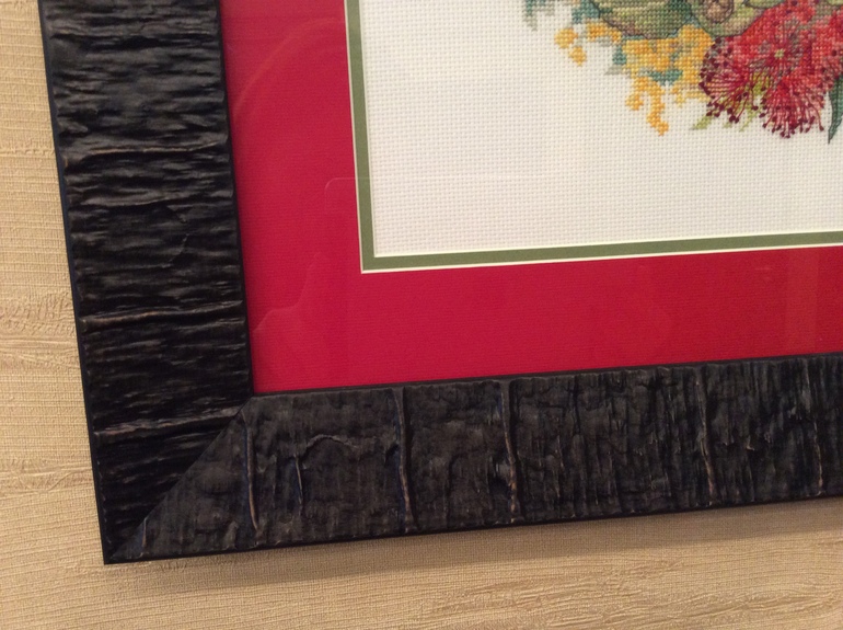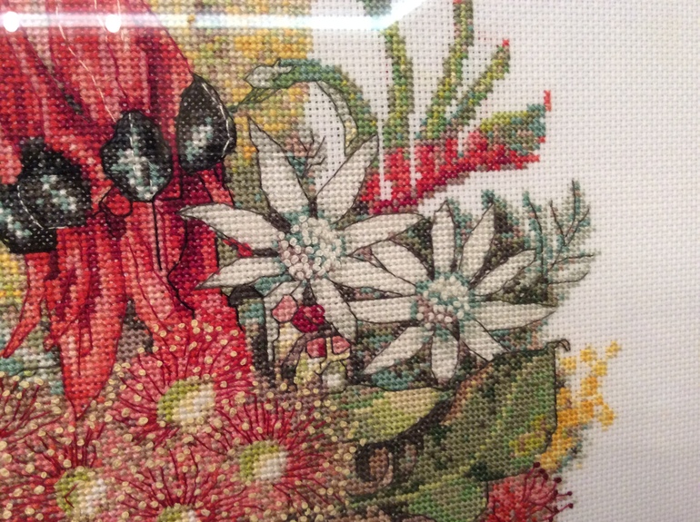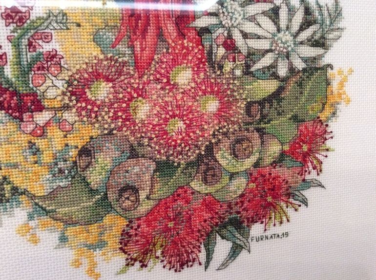 Вторая работа - Wildflower Bouquet, DMC. Перевела бы как «Букет диких цветов», хотя по-русски правильно говорить полевые цветы, так как для нас по смыслу не садовые, не домашние цветы - это полевые. А тут букет из Австралии, многие помнят мое расследование, а что же это за цветы такие чуднЫе, а там они именно дикие, то есть из дикой природы, не полевые, а пустынные, тропические и т.п. Ну вот я и не знаю, я никак иначе не видела оформление этих дикарей, как с красным паспарту и темно-коричневой рамой под какое-то тропическое дерево. Короче, тоже дикое, почти хищное. Что называется, таково видение автора. Девушка пыталась мне предложить другие варианты, я все рассмотрела, но не смогла передумать. В общем, судите сами.