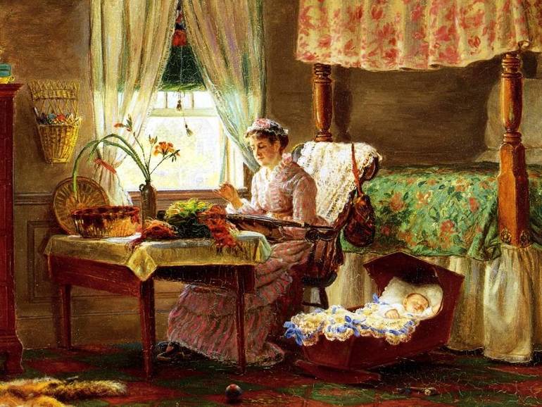 Вышивка он-лайнВсем привет. Чем порадовала вас эта неделя? В столице погода хуже некуда. Может, а вас хоть лето еще гуляет? Картина у нас в этот раз с молодой мамочкой за вышиванием. Меня впечатлила эта люлечка, до чего же милые кружева и ленты вокруг спящего младенца. Вспомнила люльки своих детей, эх, милота была. А у вас сохранились фотки люлек, рюшевых кроваток, кружевных конвертов с выписки?