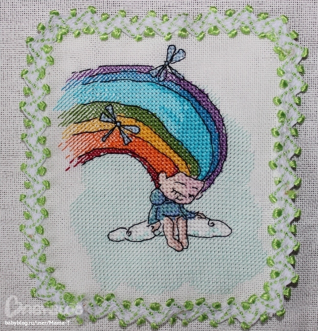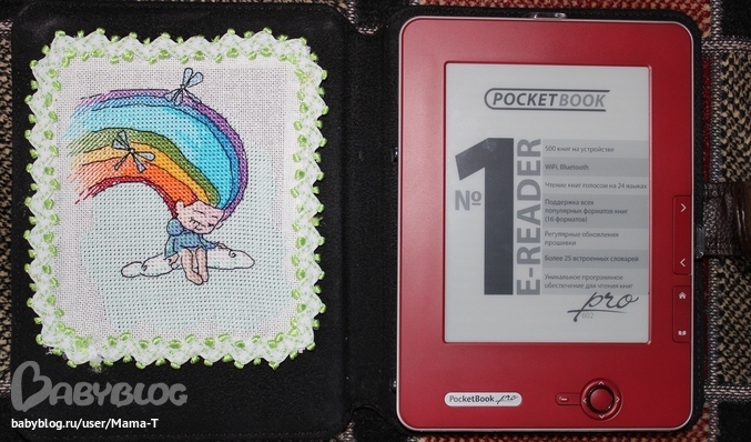 Вышивка крестомВсем привет. Как то неожиданно быстро я довела до ума свою девочку-радугу. Сегодня пристроила ее на постоянное место жительства. Теперь моя малышка будет радовать мне глаз и вызывать улыбку. Все таки я очень люблю прикладную вышивку. Только оформлять ее очень не люблю. Что оверлок, что машинка, для меня, это мучение. Просто, муки адовы. Однажды, обрабатывая края у наволочки на подушку, я даже умудрилась сломать иглу у оверлока. Ну, это же я. И в этот раз, не обошлось без неприятности. Оборвалась одна из трех нитей оверлока. А там такая сложная система заправления нитей, что я чуть не поседела, пока с пинцетами минут 40 (не преувеличиваю), ее заправляла. Гадство. Но, все позади. Обметав края, приметав и прострочив декоративную ленту, я получила вполне неплохой результат. Утром, прикрепила свою девочку-радугу на двусторонний скотч, к обложке ридера. Пусть будет всегда на виду, радует меня и окружающих:)