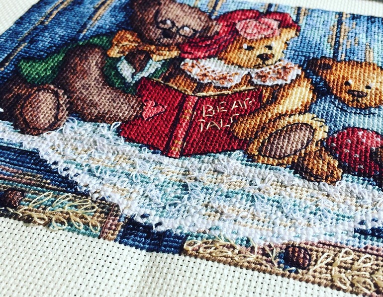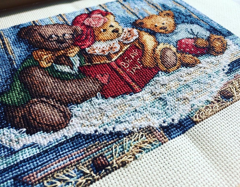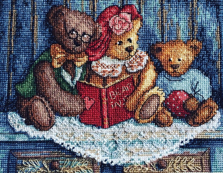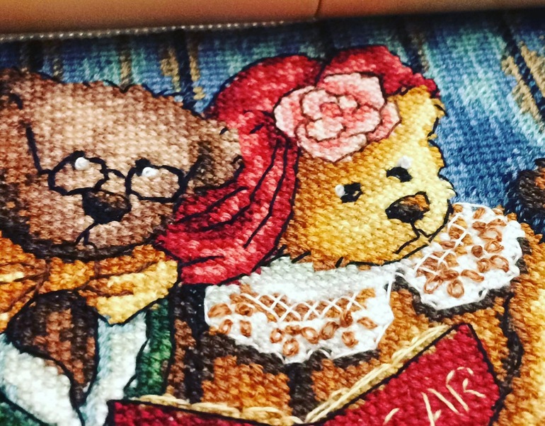 Вышивка крестомПривет, девочки ) незаметно вышились эти Мишки . Но это ж Дим, поэтому тут "просто" не бывает - веточки и листочки , а также воротничок платья - то ещё удовольствие )))