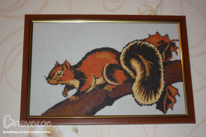 Итак - Белочка, начинала ее вышивать еще будучи в школе а закончила где то в институте те лет 10 прошло:). Этот подбор по журналу (какому не помню) - подбор в самом прямом смысле слова: на глаз по цветам на картинке - тогда я еще не знала что такое ключ:) и вышито на белой ткани типа простыня ( клетки 2 на 3 переплетения)