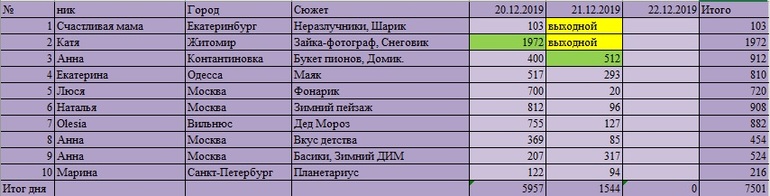 Сегодня результаты у всех поскромнее, предновогодние семейные дела захватили всех. Общий итог дня - 1544 крестика. Лидером стала Анна и её 512 крестиков, за ней бежит Анна с 317 крестиками и замыкает тройку Екатерина с результатом 293 крестика.
