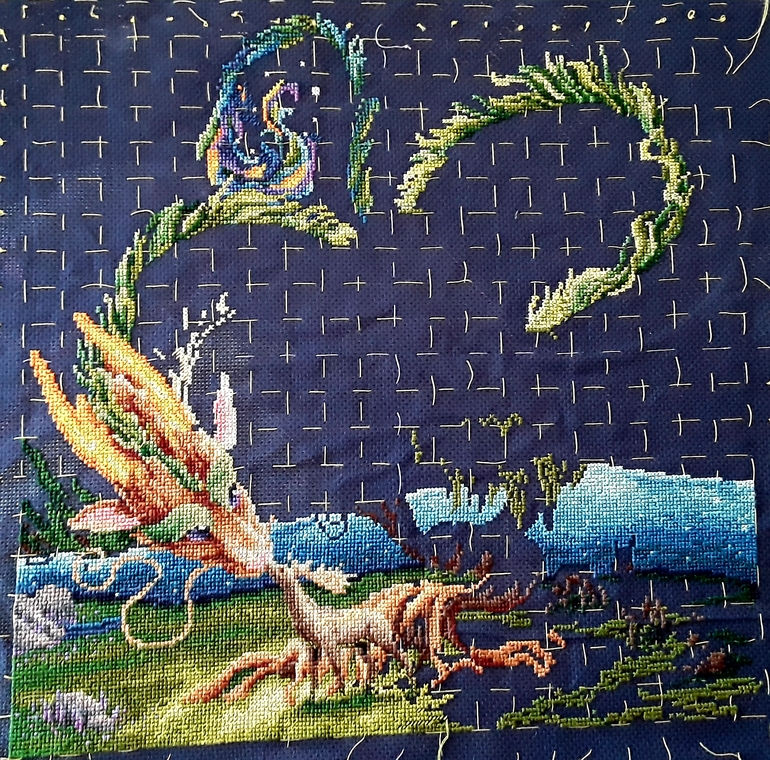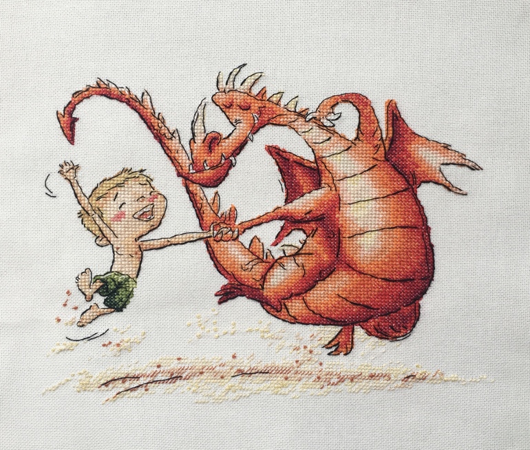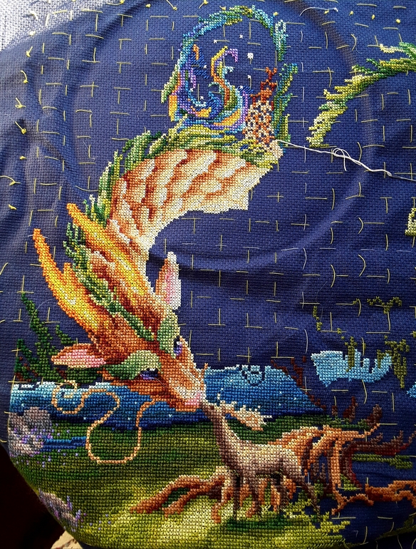 Носилась в вышивкой по всей квартире, так и не смогла уловить свет, чтобы передать всю яркость Дракона, поверьте, он намного ярче и красивее )