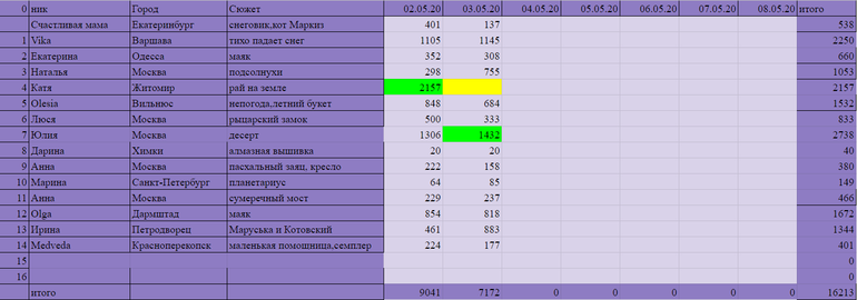 Игра "Вышивальный забег"Всем привет. Извините пожалуйста за задержку. Только домой вернулись =) лидером дня стала Юлия с результатом 1432 крестика, за ней бежит Vika c результатом 1145 крестиков и замыкает тройку лидеров Ирина с результатом 883 крестика.