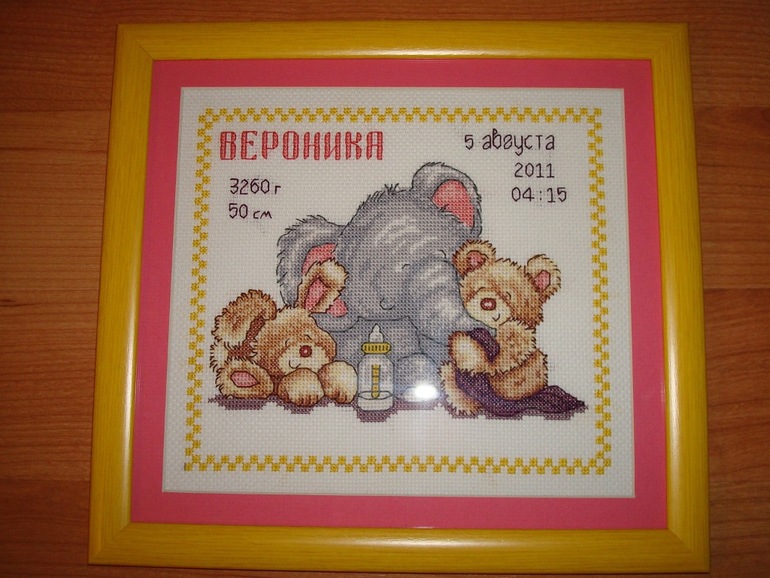 Эту метрику я вышивала подбором ниток из имеющихся по схеме, найденной в интернете.