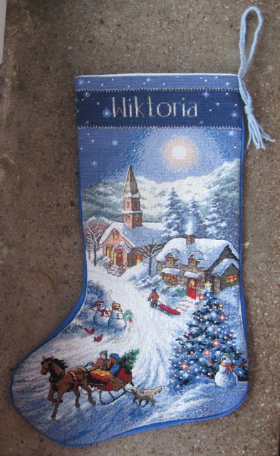 Я вышивала сапожок с этой картинкой подбором, но у меня были образцы ниток. Вроде у вас небо вышивается, как у меня полоска с именем, помню, что она там было не совсем синяя, а такая сине-фиолетовая, я вышивала дмс 336. Так получилось: