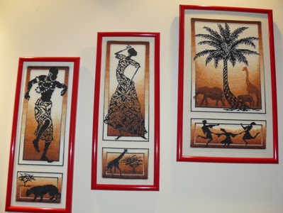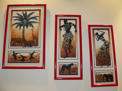 Ну, по порядку. Африкой любуюсь каждый день с утра до вечера, так как вся она висит в зале на почетном центральном месте, подходит по цветам ко всей мебели и всем игрушками)) и смотрится расчудесно. Мне даже кажется, что глядя на нее, у меня иногда поднимается настроение, так как оранжево-коричневый цвет заката символизирует для меня лето, и не просто лето, а жаркое лето, когда весь день тепло и солнечно. А зима мне надоела. Вышила вначале 3 картины, потом еще 2. Оформляла в разное время, поэтому две картины меньше по размеру. Поэтому они висят таким образом - что делает их еще более привлекательными))